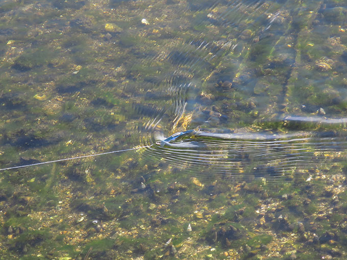 ブリブリと巻いて、スネークアクションを発動させるのでは無く、強い引き波を立てる力加減。流れに乗せながら、巻かず緩めずといった「ルアーの重みを感じる程度のリトリーブ」で、綺麗な引き波が出ると思います。
