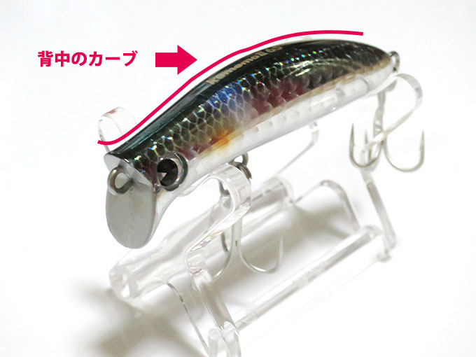 背中の部分が丸くカーブしているのが特徴ですが、引き波を立てるように引いた際、この形のおかげで、水面から飛び出すように浮いてしまう訳では無く、背中の辺りに「薄い水の膜」を纏いながら進んできます。背中を出しながらの引き波では無く、水を纏っているのが重要。