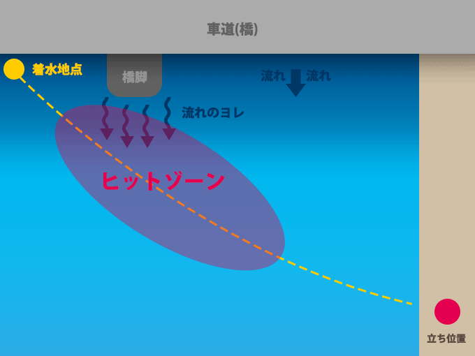 この釣り方の特徴としては、ヒットゾーンが広い事。通常の裏打ちであれば、橋脚の裏側から明暗の境目辺りがヒットゾーンになりますが、引き波を立てて引いてくると、シーバスの追尾してくる距離が長くなり、完全に明るい側でジュボっと出る事も。