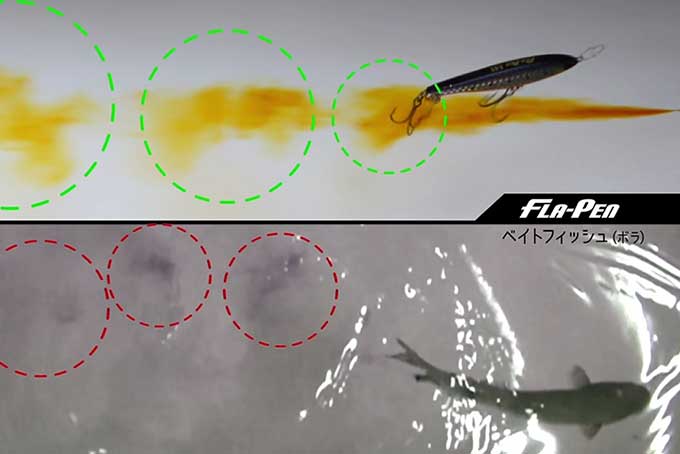 かなり後発的なインプレになるので、簡単にだけまとめてみますが、フラペン最大の特徴として挙げられるのは、テール部分に設置されたパカパカと開閉する「フラップ」の存在。このフラップが作用し、ベイトが出す波動を再現できるとの事。