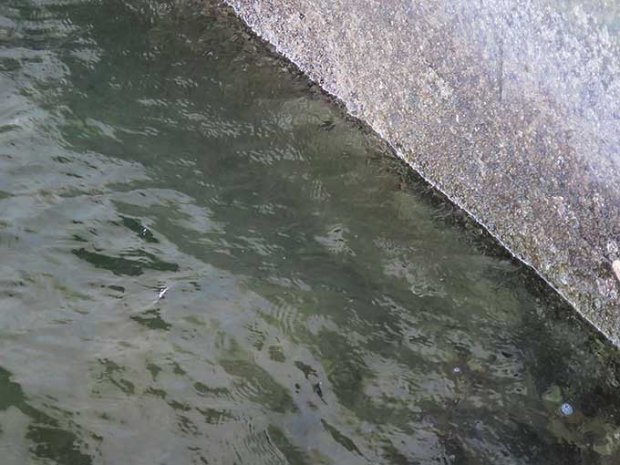 石畳みが微かに目視できるかという場所から、20センチ半ばのシーバスがパッと追いかけてきて、水質がクリアになった部分でサッと戻っていきます。