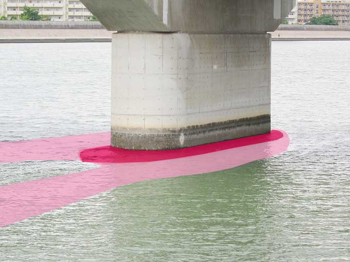写真を見て頂けると、橋脚の周りの流れが変化している事に気が付きます。