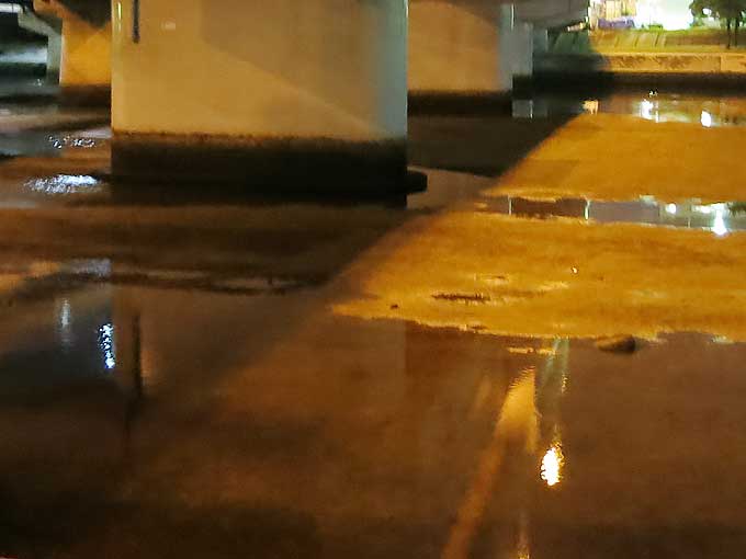 水が溜まっているように見えると言う事は、他と比べてその部分が掘り下がっているという事。この橋脚が特別な訳では無く、水の流れや工事の影響で、橋脚周辺には何かしらの地形の変化があります。夜になると、更には明暗が形成されますし。※それらのお話は、また後日にでも