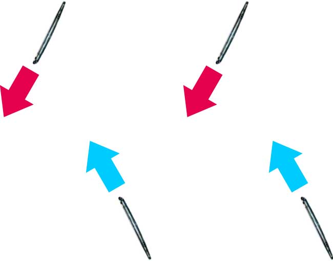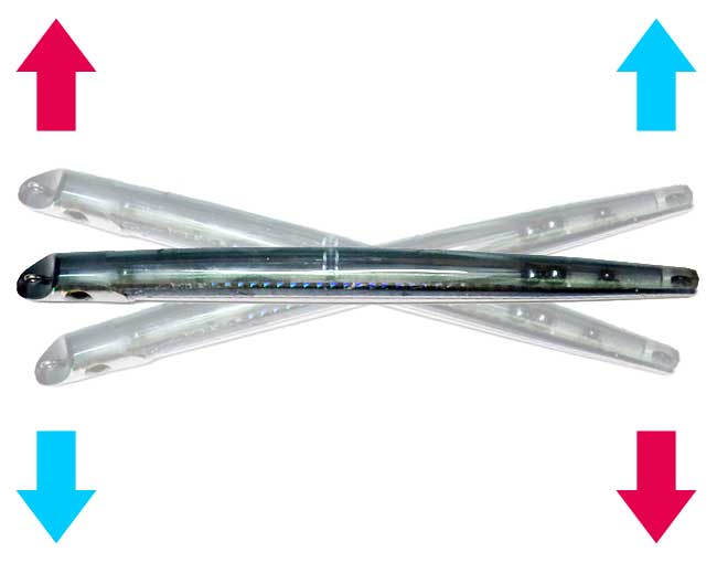 ロッドを跳ね上げてアクションさせる事によって、ルアーが左右へと鋭く飛ぶ動き。