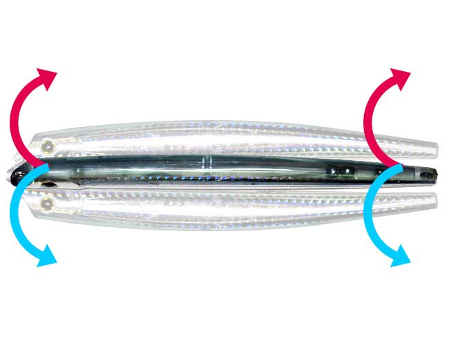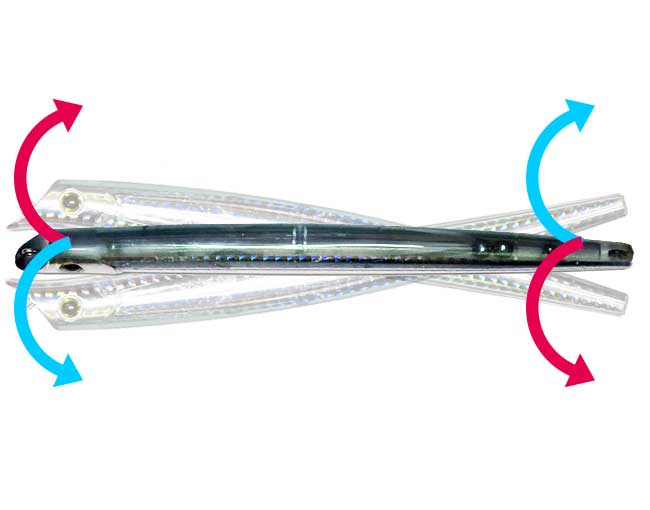 正面から見ると、左右交互に傾くような動き。ルアーを引いて来る際に下から見ると、ルアーの側面がチラチラと見えるイメージ。側面のカラーによっては、ダメージを受けたベイトにも見える。