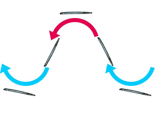 支点を中心に、左右へバランスを崩しながら泳いでくる動き。片方に崩れたバランスを戻そうと、逆方向への力が働き再度同じ事を繰り返す。引いて来ると、テール側を振りながら戻ってくるようなイメージ。アピール力は高い。