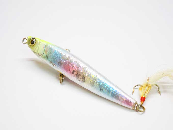 ただ引きでヨタヨタと動き、トゥイッチングを加えると、上向き、左右に大きくスライド。スローはもちろんのこと、速引きでも意のままのアクションが演出できます。2カ所に備えた固定ウエイトと、風きりのよいフォルムが抜群の飛距離を実現。シーバスはもちろん、青物やクロダイも実績の高いルアーです。
