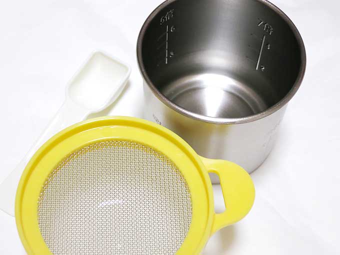 ステンレス製ポット、裏ごし、計量スプーン、保存用フタ、ご飯茶わん。