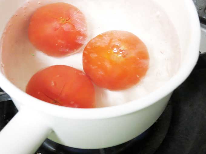 切り込みを入れたトマトを、沸騰したお湯に入れます。