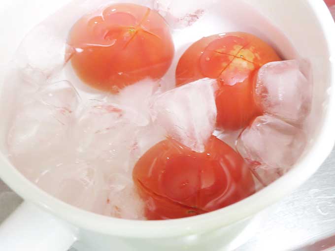 氷水にしばらくつけておくと、皮が簡単にむけるようになっているんで、ササっと皮を取ってしまいます。