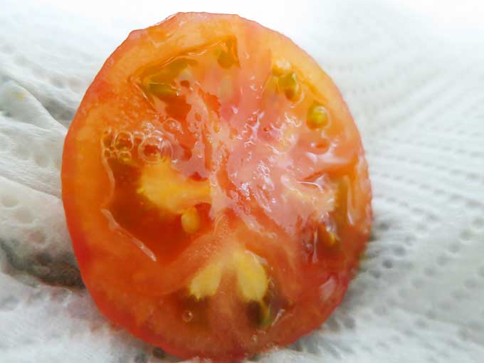 写真を見たら分かりますが、トマトの種が付いている白い部分を包丁で切り離し、後はチョチョイとほじれば簡単に種が取れます。
