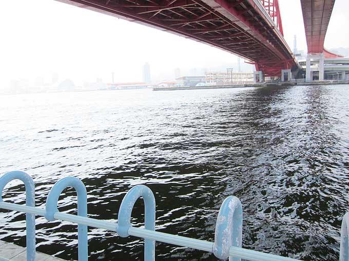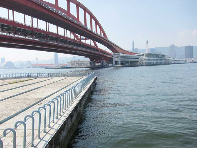 橋の下には写真のようなクボミがあり、そこを境に両岸で釣りを楽しめます。撮影時(2010/08)の時点では、神戸に向かって左側の護岸が工事中の為に立ち入り禁止となっていました。