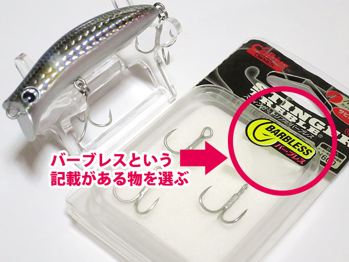 ルアー釣りの場合、釣具屋さんにて「バーブレス」と表記されている釣り針を購入し、「ルアーフックの交換方法」を参考にしながら、交換作業を行えば完了です。ルアーに付いている輪っかを外せるプライヤーがあると、手早く交換する事ができます。