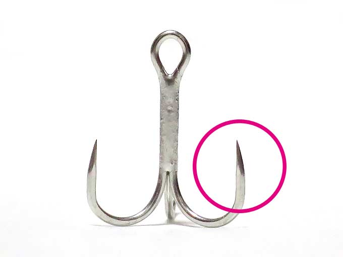 写真はルアー用の釣り針ですが、ファミリーフィッシングで使うサビキにも、同じようなカエシがついています。これは、釣り針に掛かった魚が逃げないようにする為の物ですが、何かの拍子でこの部分まで刺さってしまうと、体から針を抜くのが困難になります。