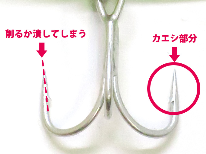 釣り針のカエシ部分を削るか潰すか