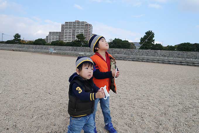 まずは、坊っちゃんのマリオカートからですが、良い風が吹いたのでアっという間に上空へ。凧も安定しているので、凧糸を坊っちゃんに手渡し一人でコントロールしてもらいます。