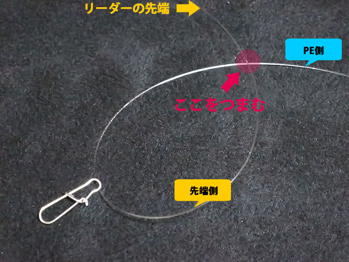 リーダーの先端をスナップにくぐらせ、輪っかを作ります。その際に、リーダーの先端が上にくるようにして、交差している部分を指で押さえます。