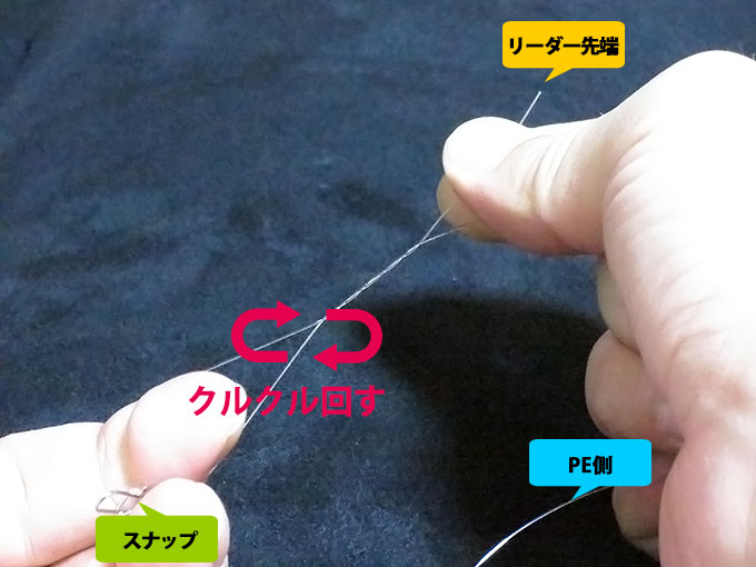リーダーの先端をスナップにくぐらせた後、指を突っ込んでクルクル回すのは自己流なのかもしれませんが、1回1回編み込むよりは早くて手軽なので、自分はこのやり方で結んでいます。