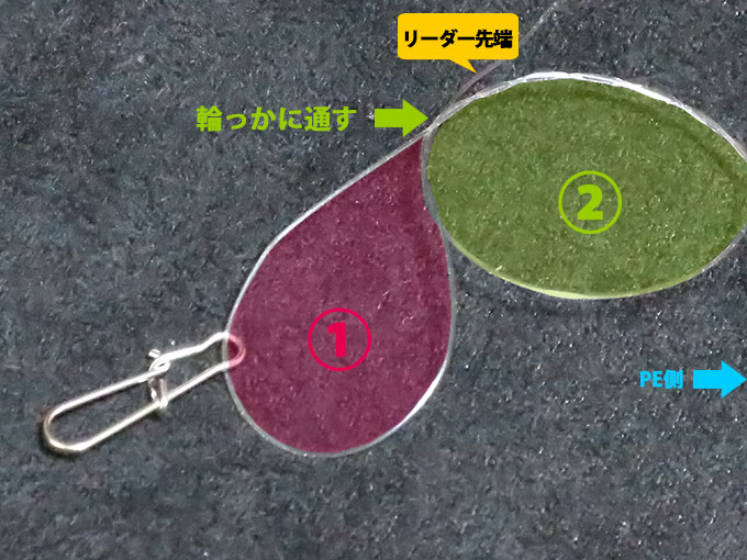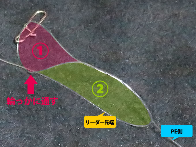 リーダーの先端を①に通す事によって、輪っか②が出現します。①を通したリーダーの先端を戻すようにして、輪っか②に通してあげます。これにて基本作業は終了。