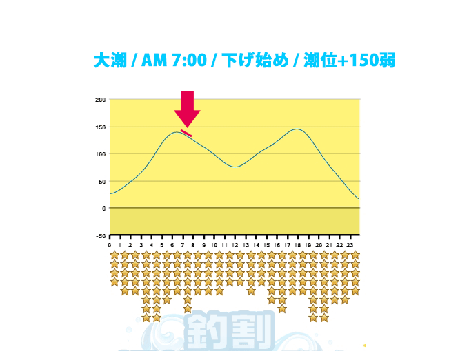 上記のような場合、好調だった要因として真っ先に思う浮かぶのは、魚の活性が上がっている朝マズメという時間(タイミング)。次に思い浮かぶのは、満潮からの下げ始めという潮の動き。