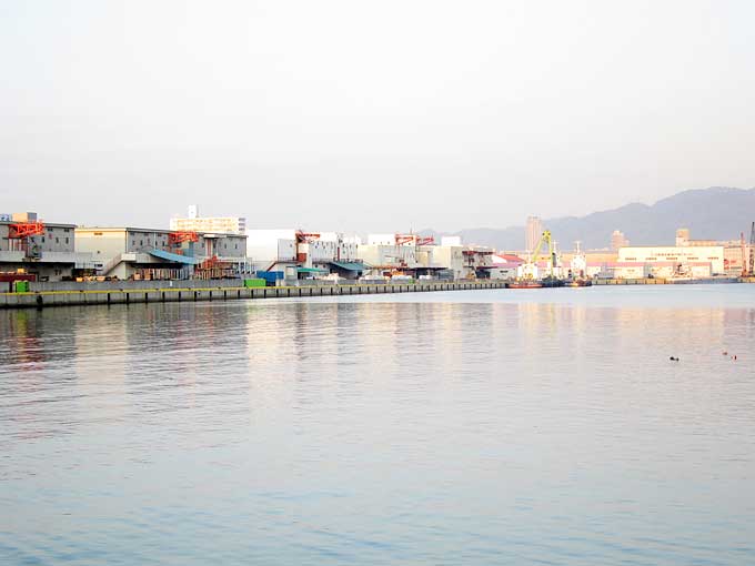 潮見町水道中央付近から芦屋川の河口を眺望。潮見町水道の根元は芦屋川の河口となっていて、シャローフラットの砂浜が続いています。根元付近は浅すぎてオカッパリでは攻略が難しいと思います。写真中央に排水溝が見えますが、オカッパリの場合はこの排水溝辺りからがフィールドになります。