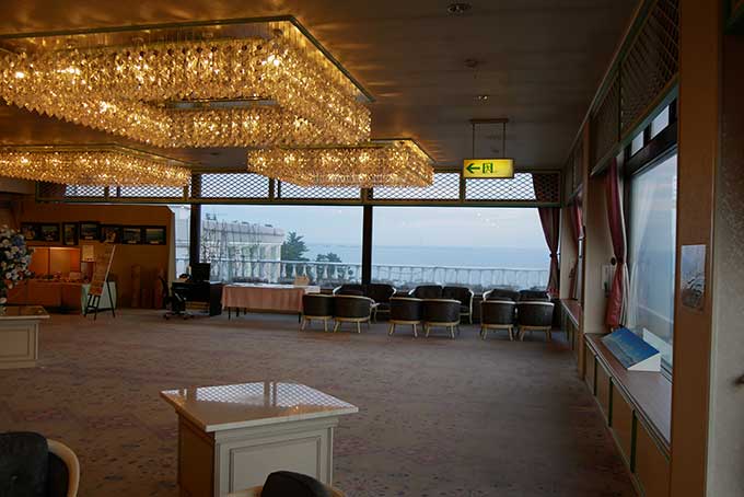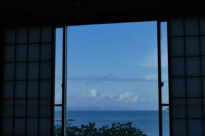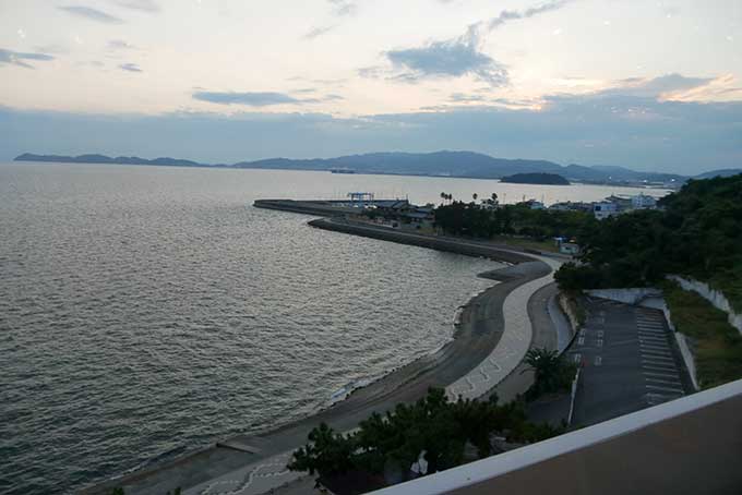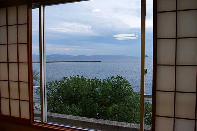 スタッフさんに車の鍵を預けてからは、ロビーにてお茶菓子を頂き小休憩。大きな窓の外には海が広がり、夕暮れ時の景色が何とも言えない美しさ。しばらく景色を楽しんだ後は、スタッフさんに宿泊する部屋まで案内してもらいます。