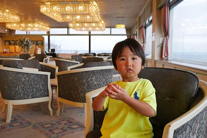 夕食の会場となっている広間の別階に、大浴場となっている温泉があったので、食事の後はお風呂に入ってから部屋に戻る事に。坊っちゃんは大浴場が大好きなようで、露天風呂に浸かりながらオッサンのように寛いでました。