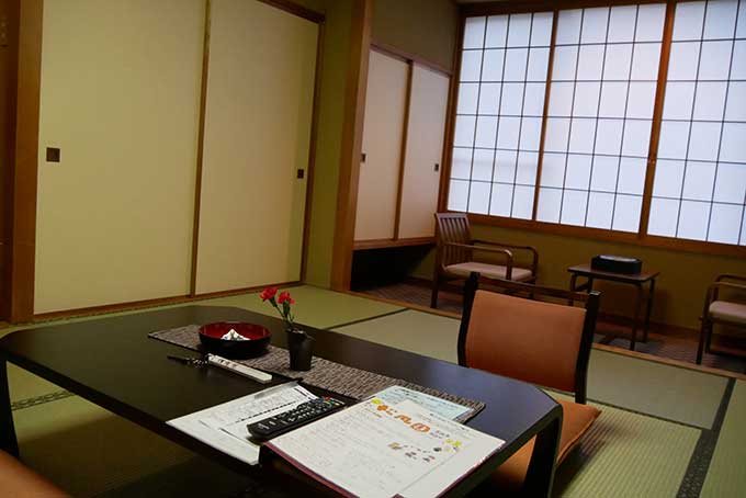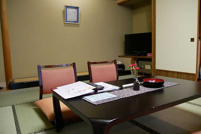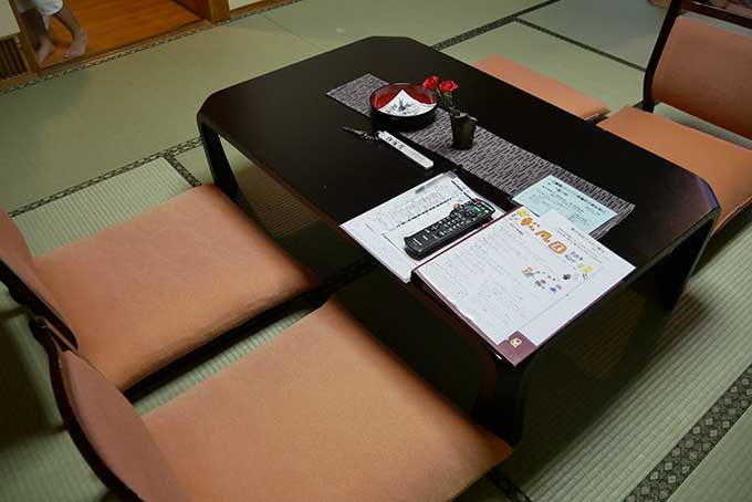 部屋に入ると落ち着いた感じの和室で、心地良く冷えた冷房が快適でした。荷物を降ろして一息つくと、子供達はテーブルに置いてあったお茶菓子をモグモグ。