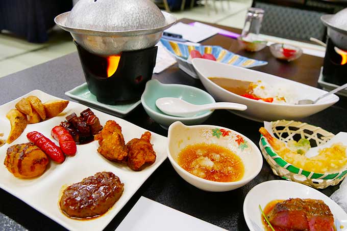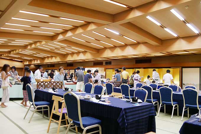 海を眺めながらボーッと寛いでいると、いつの間にやら夕食の時間となったので、迷路のような館内を歩きながら、夕食のバイキング会場となっている広間へ向かいます。靴を脱いで広間へ入ると、宴会場のようなスペースに並べられた料理を発見!!