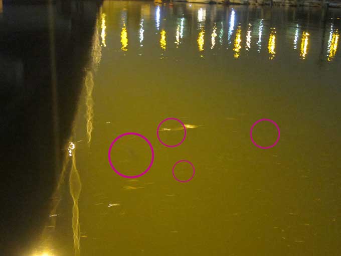 どうやら、木や草といった漂流物に付いている、先程のベイトをガツガツ食べている感じ。あちこちでボイルが起こっています。