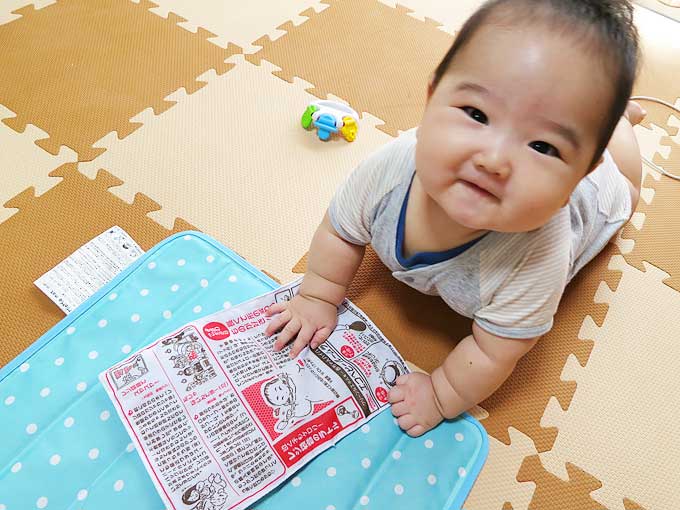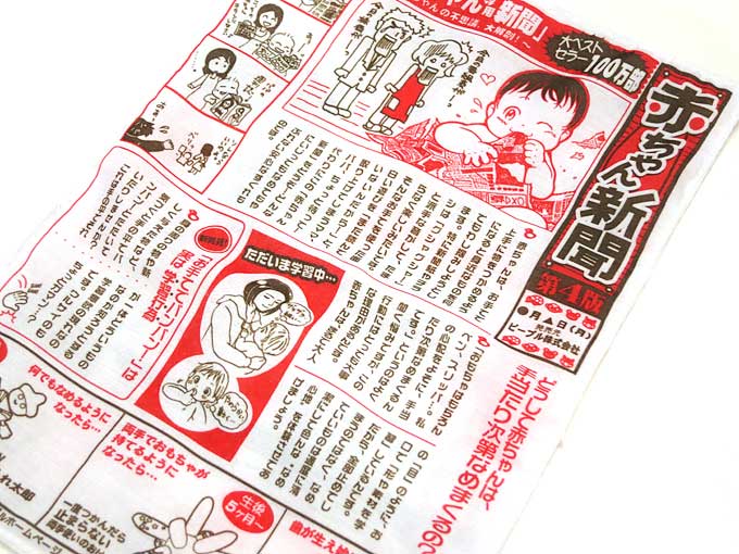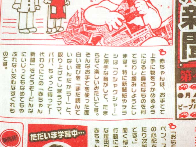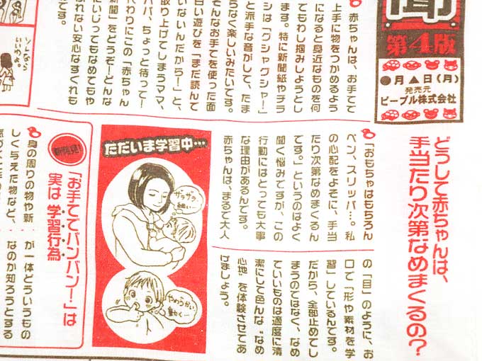 この「赤ちゃん新聞」。舐めても大丈夫だし、中にビニールみたいなのが入ってて、触るとシャカシャカ音が出るんです。