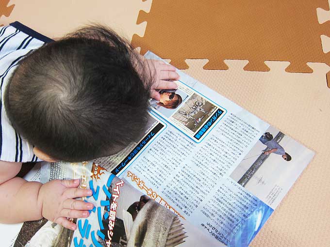 うちの坊ちゃん、触ってる物を取っても泣かないんですが、チョッピリ寂しそうな雰囲気をかもしてます。なもんで、この「赤ちゃん新聞」を代わりに渡してあげると…。