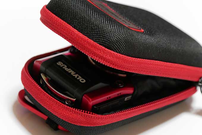 自分の場合、ウェアラブルカメラとして使う予定は無かったので、オリンパスから販売されている「ハードタイプのカラナビ付きカメラケース」を使用していますが、カメラにピッタリのサイズなのでガタガタ動きません。