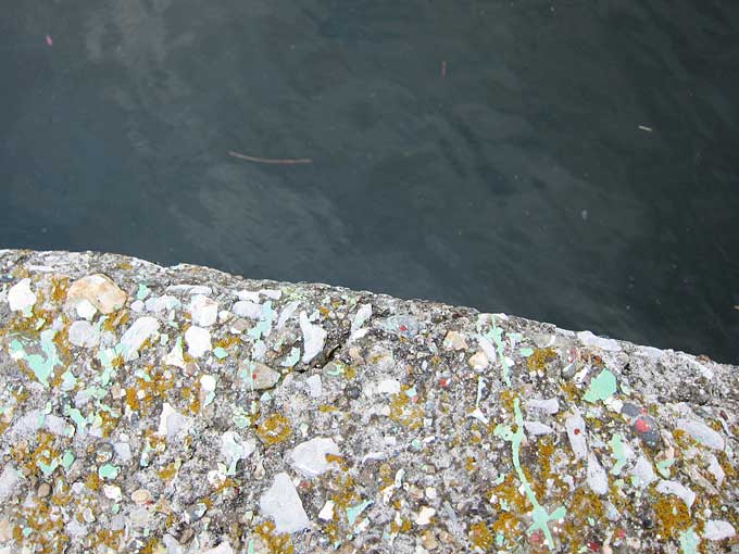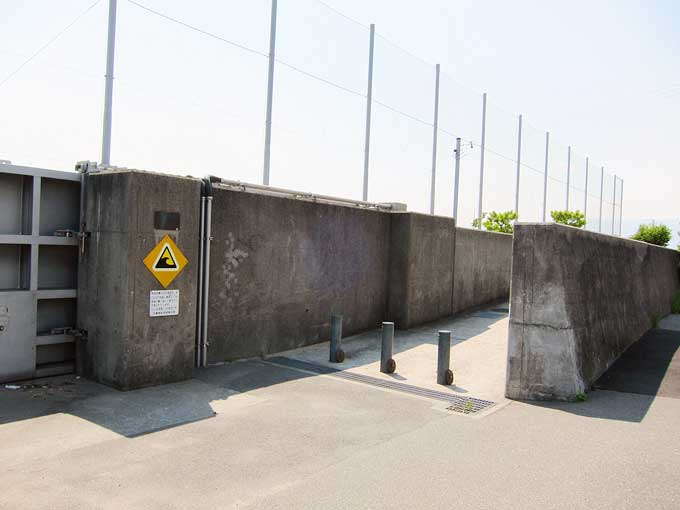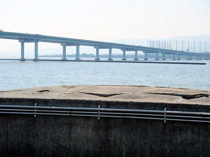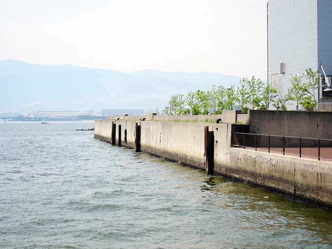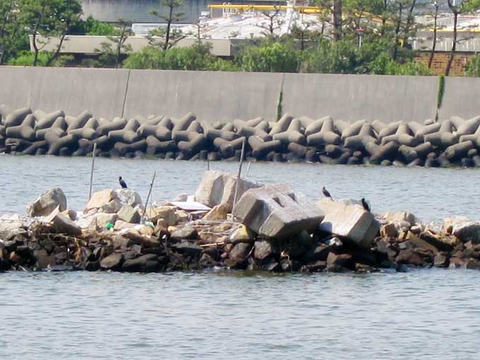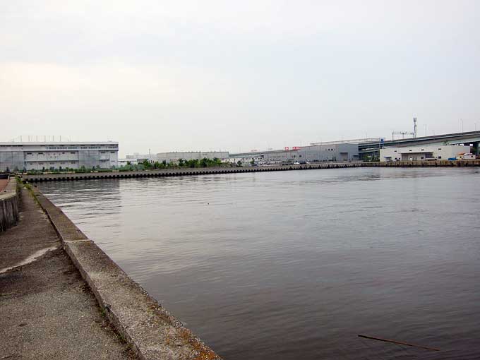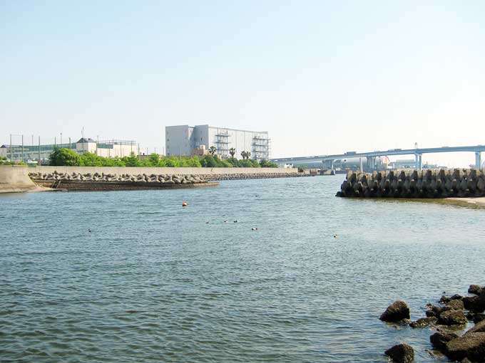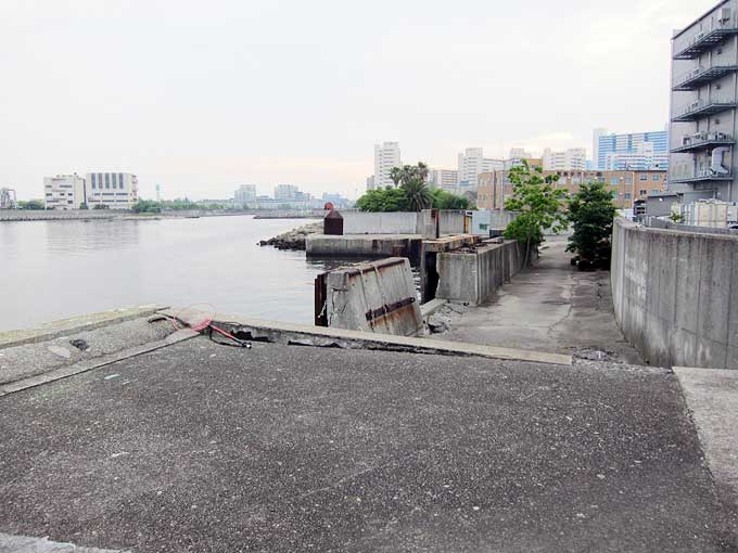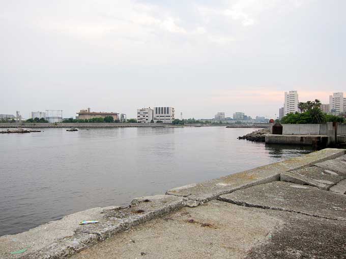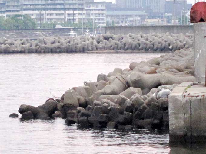 分かりやすいように対岸から撮影しました。西側の突き当りの壁を超えると上記写真のようになっています。足場は主にテトラで形成されています。