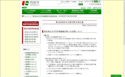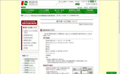 2 2西宮市が救援物資の受付を開始!!2011年03月19日 4,024 view 西宮市が被災地からの要請を受け 救援物資の受付を開始したようです!! 救援物資の受付 被災者や関係団体等からの要請を受け、皆さんからの救援物資の提供を募ります。…