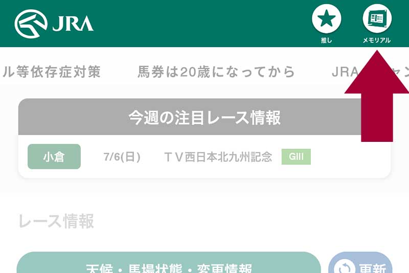 アプリ上部の右上にある『メモリアル』という項目をタップします。