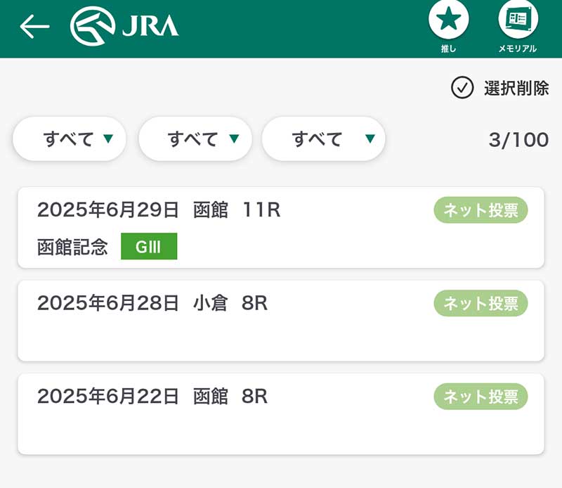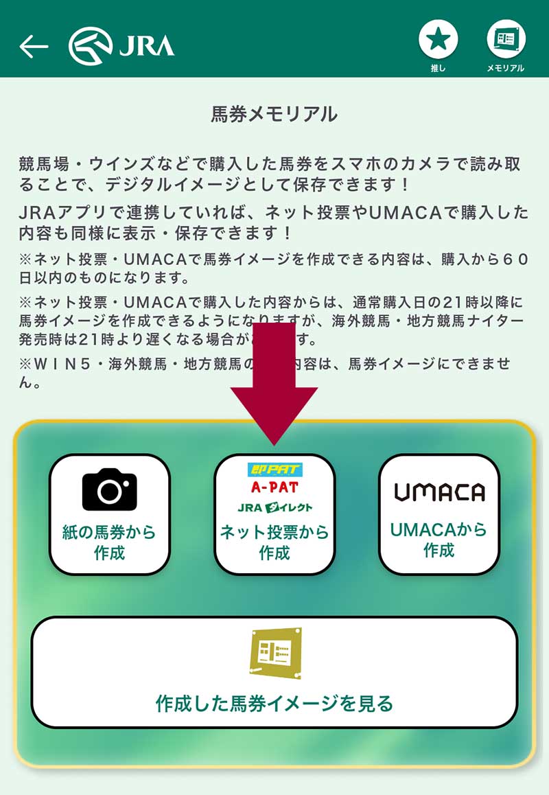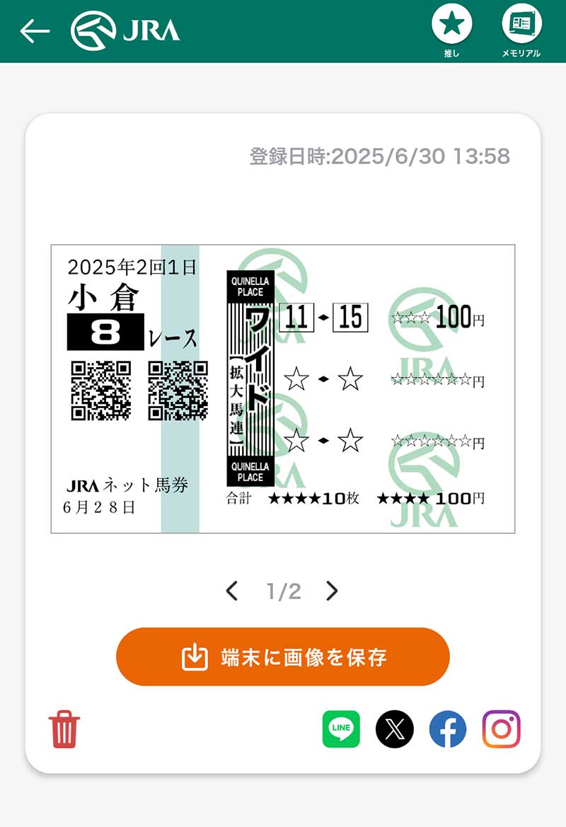 メモリアルとして作成した“馬券画像の保存は100枚まで”という枚数制限があるので、手元に残しておきたい場合は、ダウンロードしておくのが無難です。