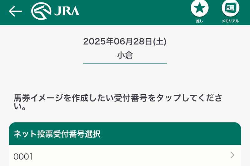 実際に購入した『ネット投票受付番号』が表示されるので、希望の番号をタップ。