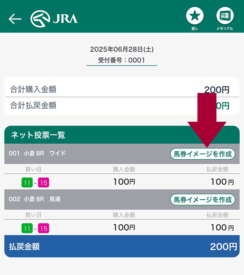 購入した馬券の横に『馬券イメージを作成』ボタンがあるので、画像を表示させたい馬券を選びボタンをタップ。