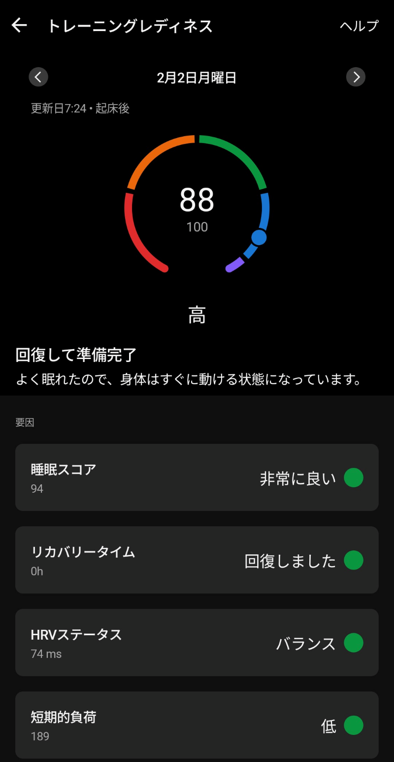 このように、トレーニングレディネスは、睡眠スコア・HRV・短期的負荷などの項目を複合判断してくれる物で、起床時における『現在の自分の状態』を客観的に判断するためのデータが網羅されています。