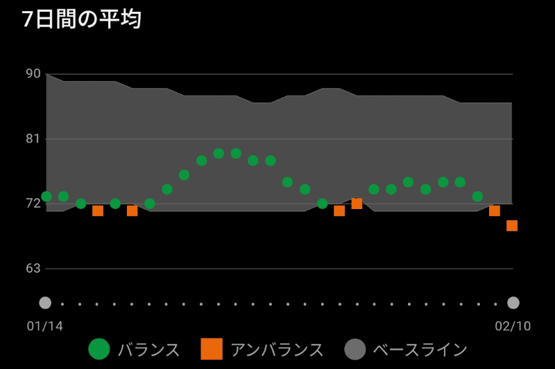 そして、それらのデータは腕に巻いた瞬間から計測が始まる物(心拍や歩数など)もあれば、数日~数週間かけ平均を割り出してから表示が始まる物(レディネスやHRV・短期的負荷など)もあります。