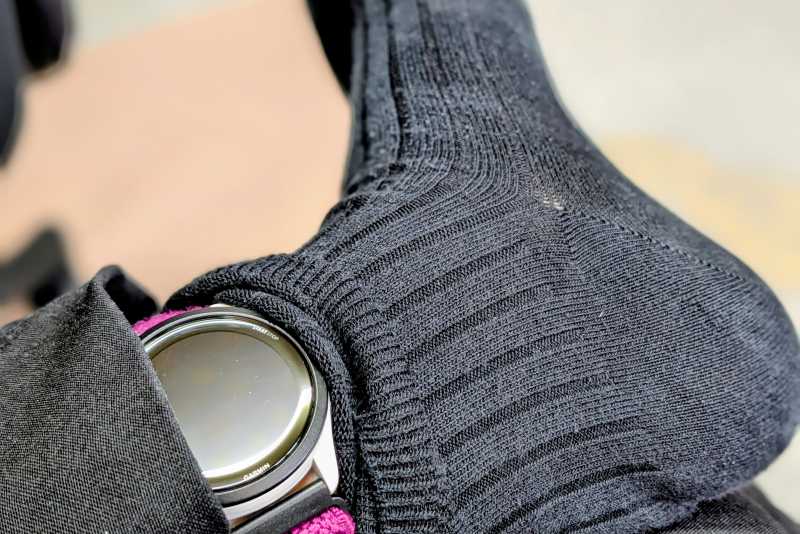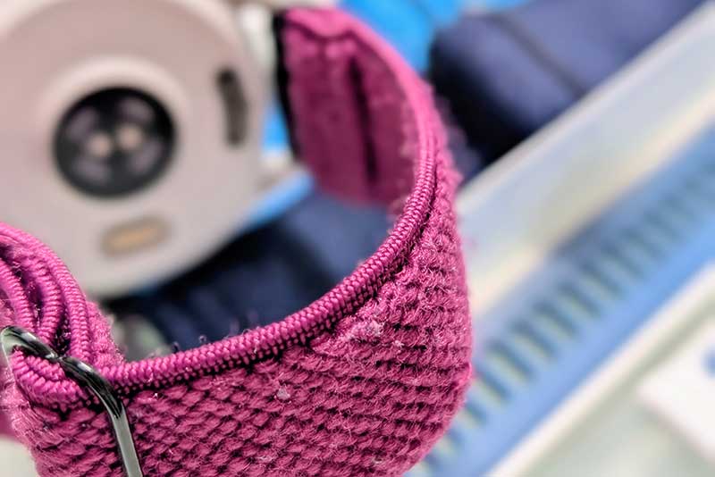 一方、このナイロンバンドなら、ゴムのように弾性があるので、自分の好きな付け心地に微調整できるし、ベルトの交換不要で手首や足首と長さを調整するのも簡単。※交換当初はダサいな…と思いましたが、使ってみたら便利で(笑