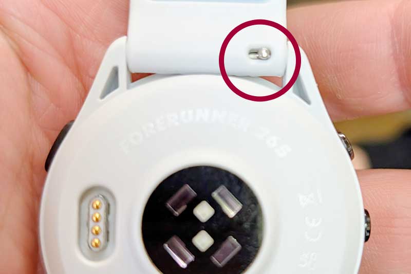 写真の丸で囲んだ銀色部分、Garminの「Quick Release(クイックリリース)バンド」であれば、このポッチをズラすだけで簡単にバンドを交換できます。※時間があれば、また後日に詳細記事でも書きます。