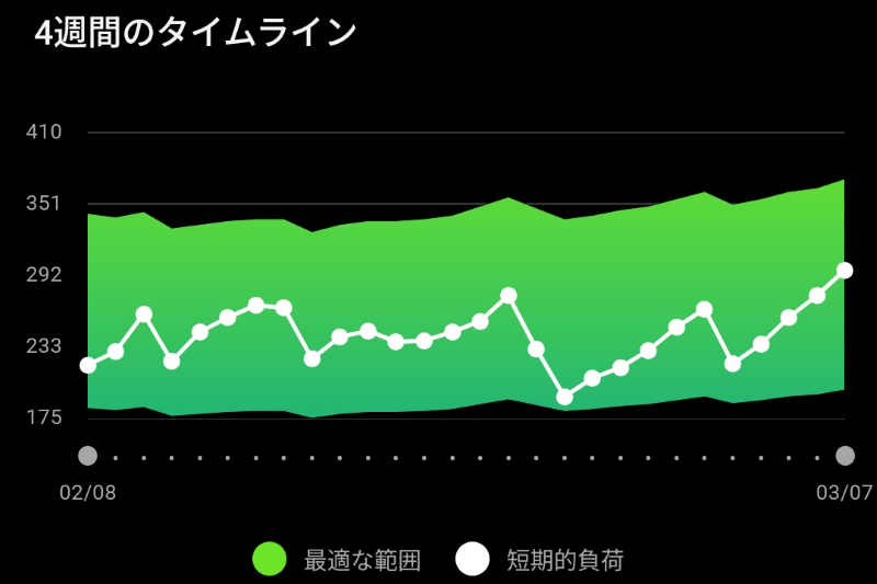 ここ数日の運動量が、自分の体力に対して「適切か」を表示するもので、負荷が『最適範囲』に収まっているかを確認できます。低ければ「調整が必要」、高ければ「オーバーリーチ(やりすぎ)」と教えてくれます。