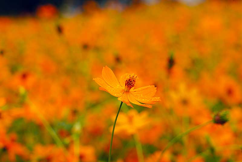 どちらのエリアも甲乙つけがたい美しさ。 キバナコスモスは水滴がついてしっとりとした表情、センセーションは密集して咲くことで絨毯(じゅうたん)のようでした。