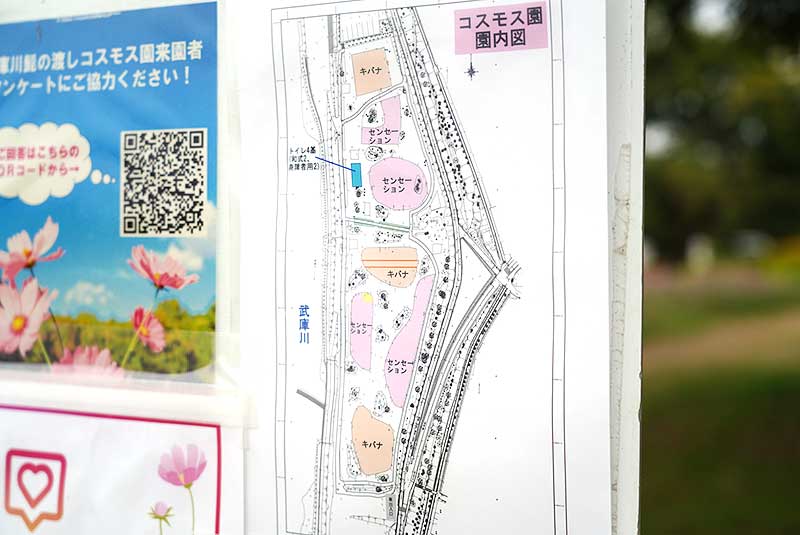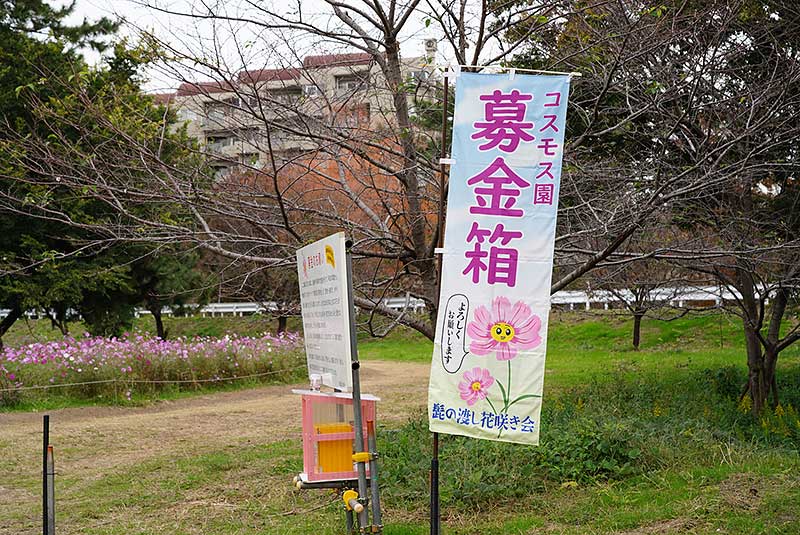この素敵なコスモス園は、地域のボランティアの方々や「髭の渡し花咲き会」の皆さんの手で運営されているようです。 (入口に募金箱もありました!)
