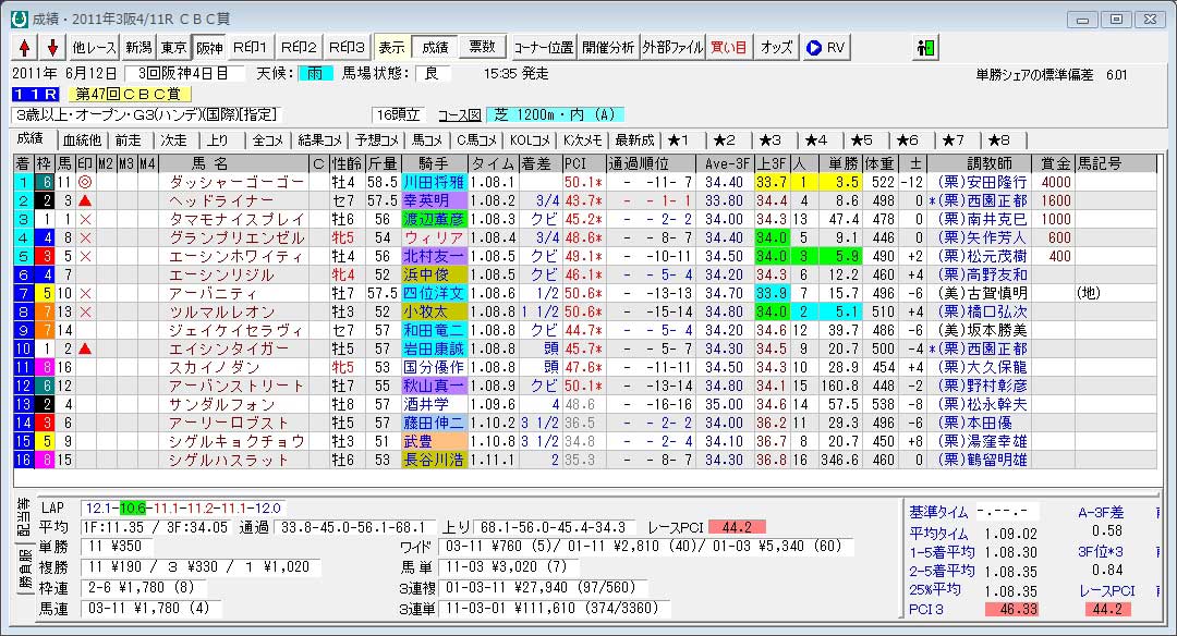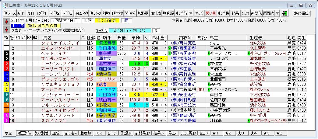 レース一覧画面で、自分が予想するレースをクリックすると、そのレースの基本画面が出てきます。今回は、日曜のCBC賞を例にしてみました。この「基本画面」から、いろんな項目にアクセスして、自分なりの予想をサクサクと進めていく事になります。