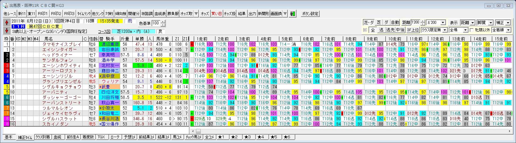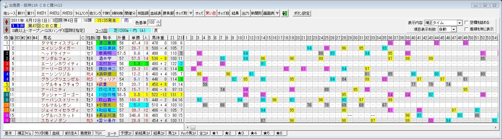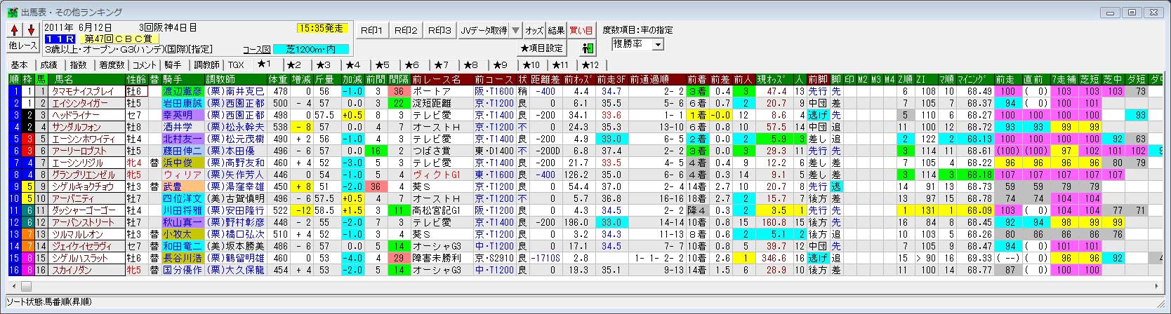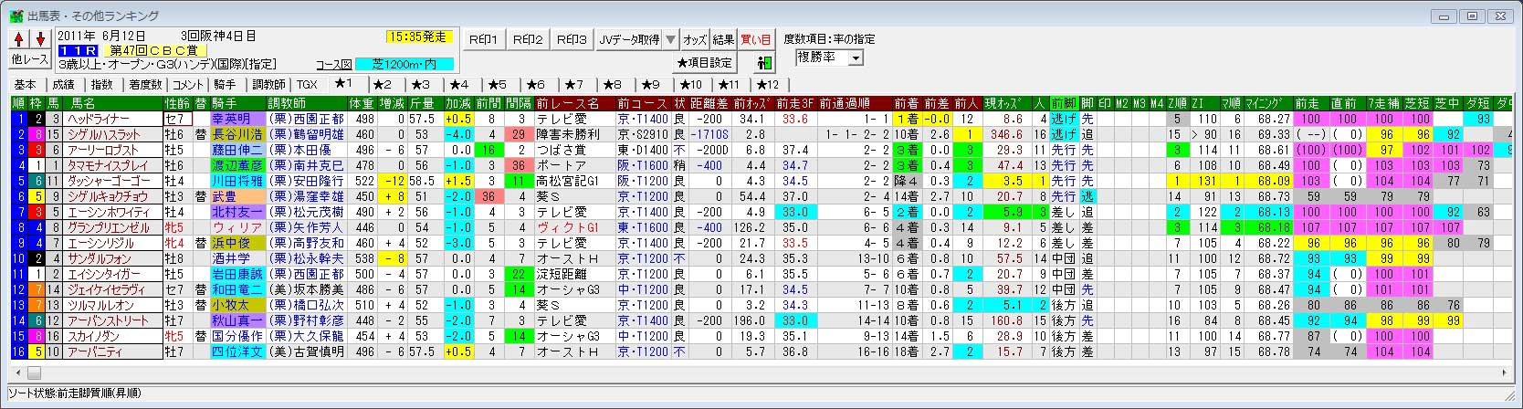 基本画面上部の「他ランク」タブをクリックすると、その他のランキングが表示され、レースに必要な情報を好きなようにソートさせる事が可能です。また、この画面の表示項目は、自分の好きな物を好きな順番に表示させる事が出来ます。