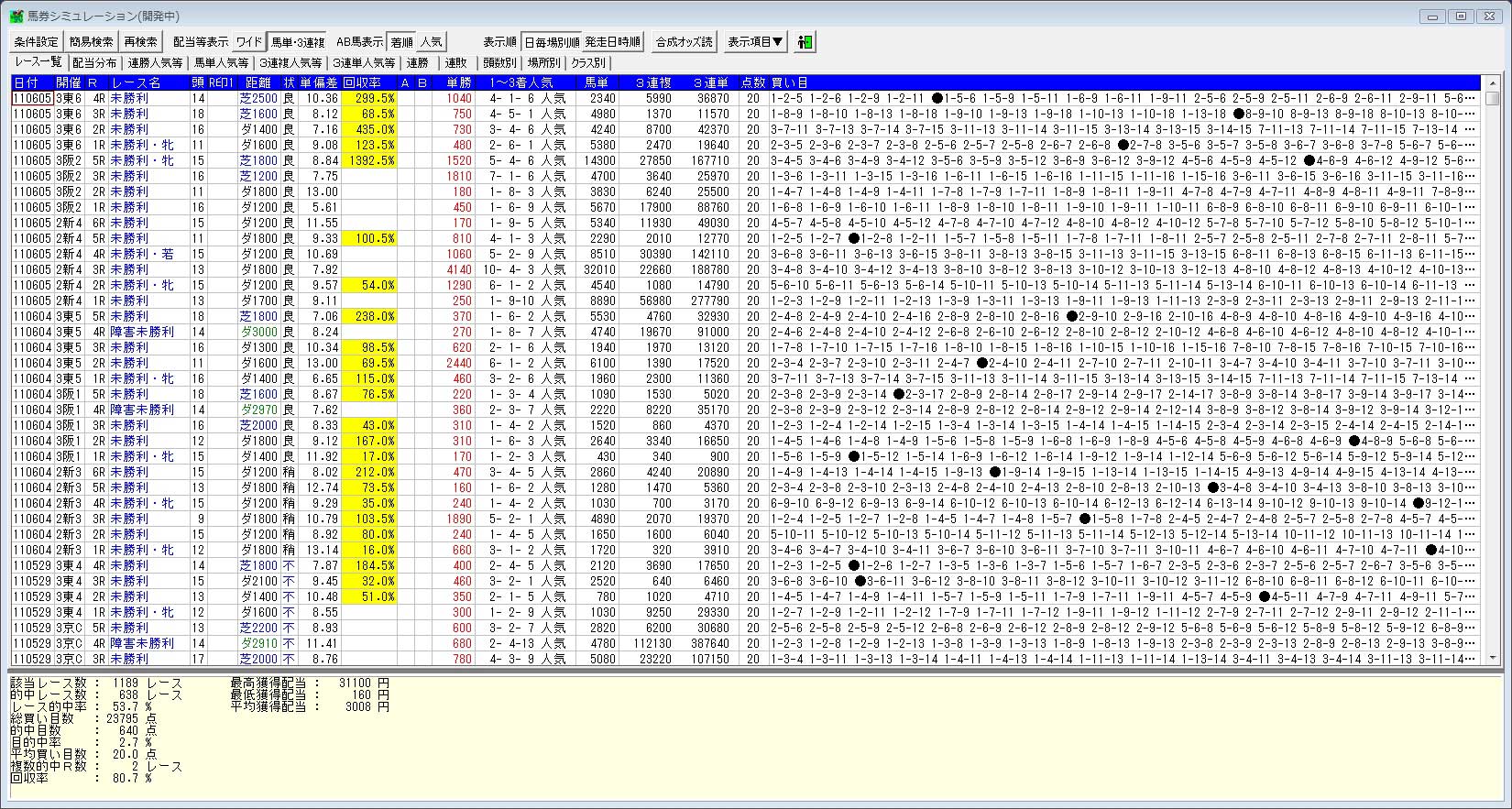 まぁ、今回はザックリBOXで算出しましたが、馬券の種類やクラス・コースといった様々な指定が可能なんで、これを使って回収率100%を越えるメソッドを探すのも楽しいです。
