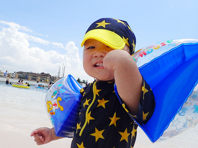 3回目となるラグナシアでは、お気に入りの日陰エリアを発見!幼児プールやビーチパークにも”水上アスレチック”ができたりと、パワーアップしていました!!